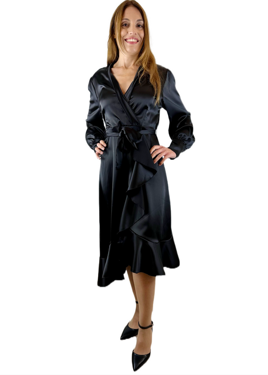 VESTITO MIDI IN RASO CON SPACCO LATERALE E VOLANT