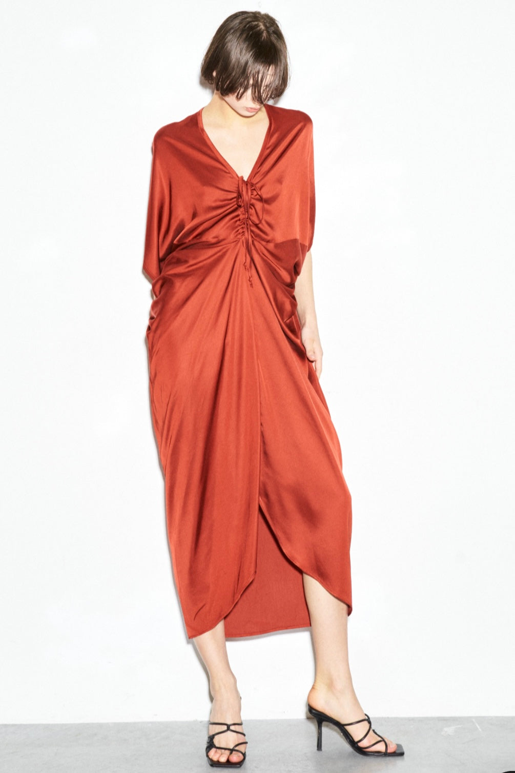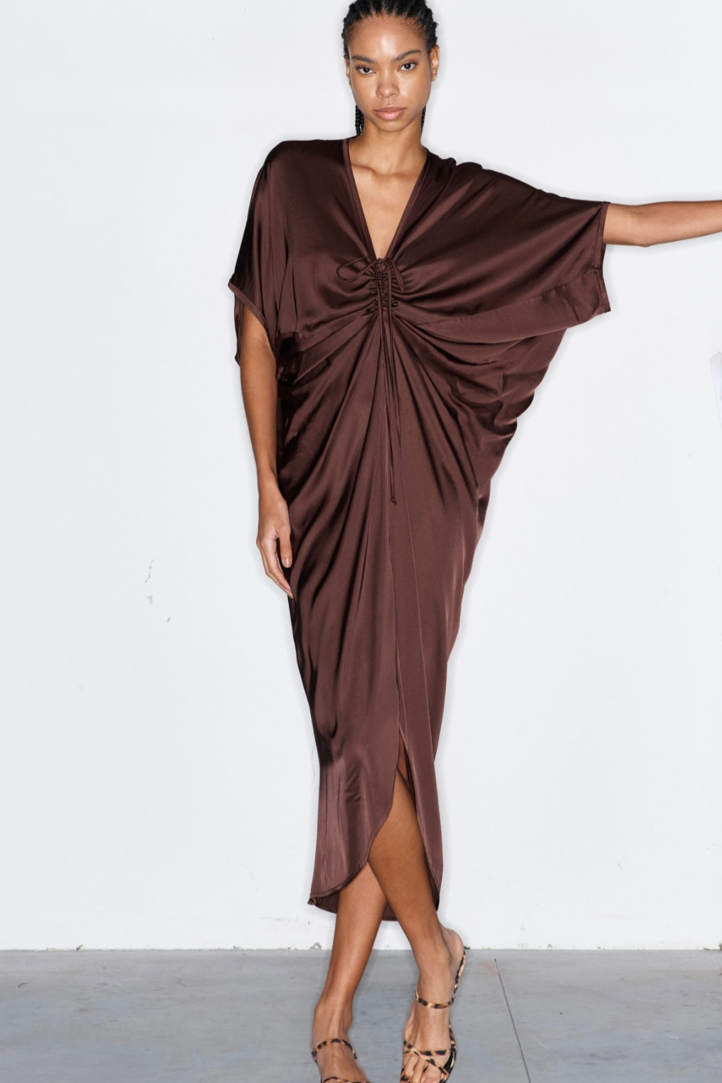 Abito caftano in viscosa fluida con maniche a pipistrello che garantisce comfort e movimento. Scollo a V elegante con coulisse regolabile per creare un drappeggio sofisticato e personalizzato. La linea asimmetrica, più corta davanti e più lunga dietro, conferisce un'allure contemporanea e raffinata. Perfetto per occasioni speciali, abbinalo a sandali gioiello o décolletés per un look impeccabile e chic.