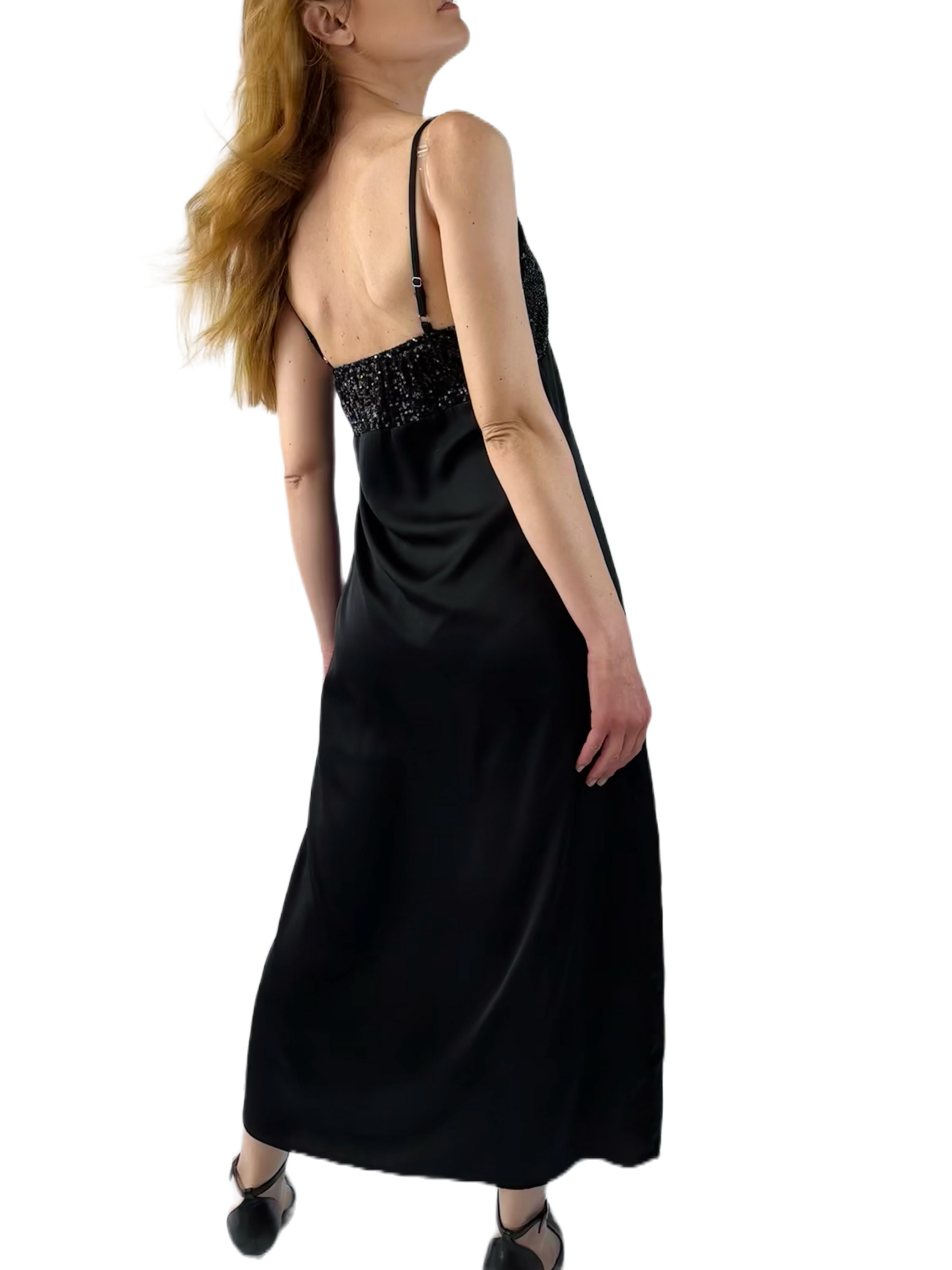 Vestito lungo 3/4 con spalline regolabili fini, realizzato in tessuto viscosa. Senza maniche, con scollatura a V. Dettaglio di paillettes sul fronte e retro nella parte alta del vestito. Questo abito offre una vestibilità elegante e slim, perfetta per ogni occasione. Con il suo classico scollo e proporzioni conferisce eleganza, mentre la schiena scoperta aggiunge un tocco di fascino. Questo vestito promette uno stile semplice e sofisticato.