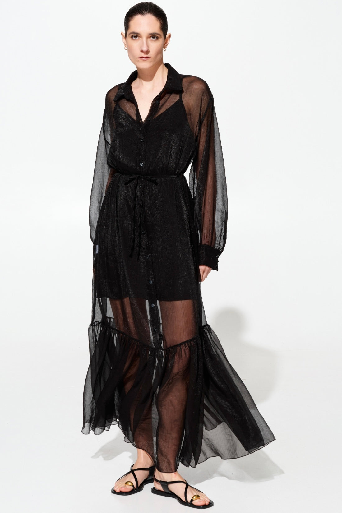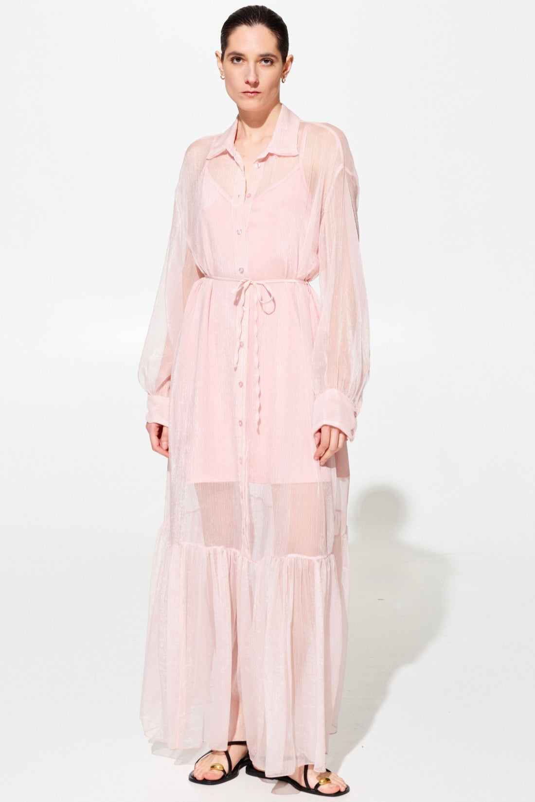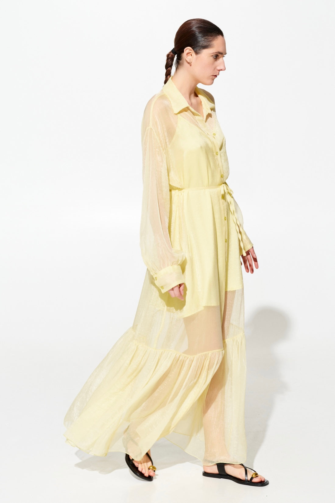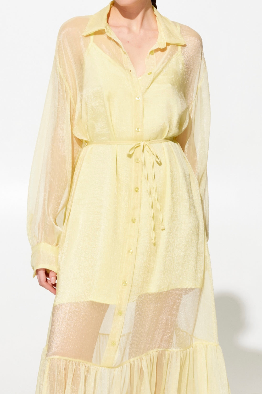 Elegante abito lungo in chifone che unisce sofisticatezza e comfort. La sottoveste in viscosa garantisce una caduta perfetta e una vestibilità fluida che valorizza la silhouette. Caratterizzato da un colletto a camicia classico, cintura in chifone regolabile in vita e chiusura frontale con bottoni per un'apertura pratica. Disponibile in tre tonalità raffinate: rosa, giallo e nero. Taglie S/M e M/L per una vestibilità versatile.