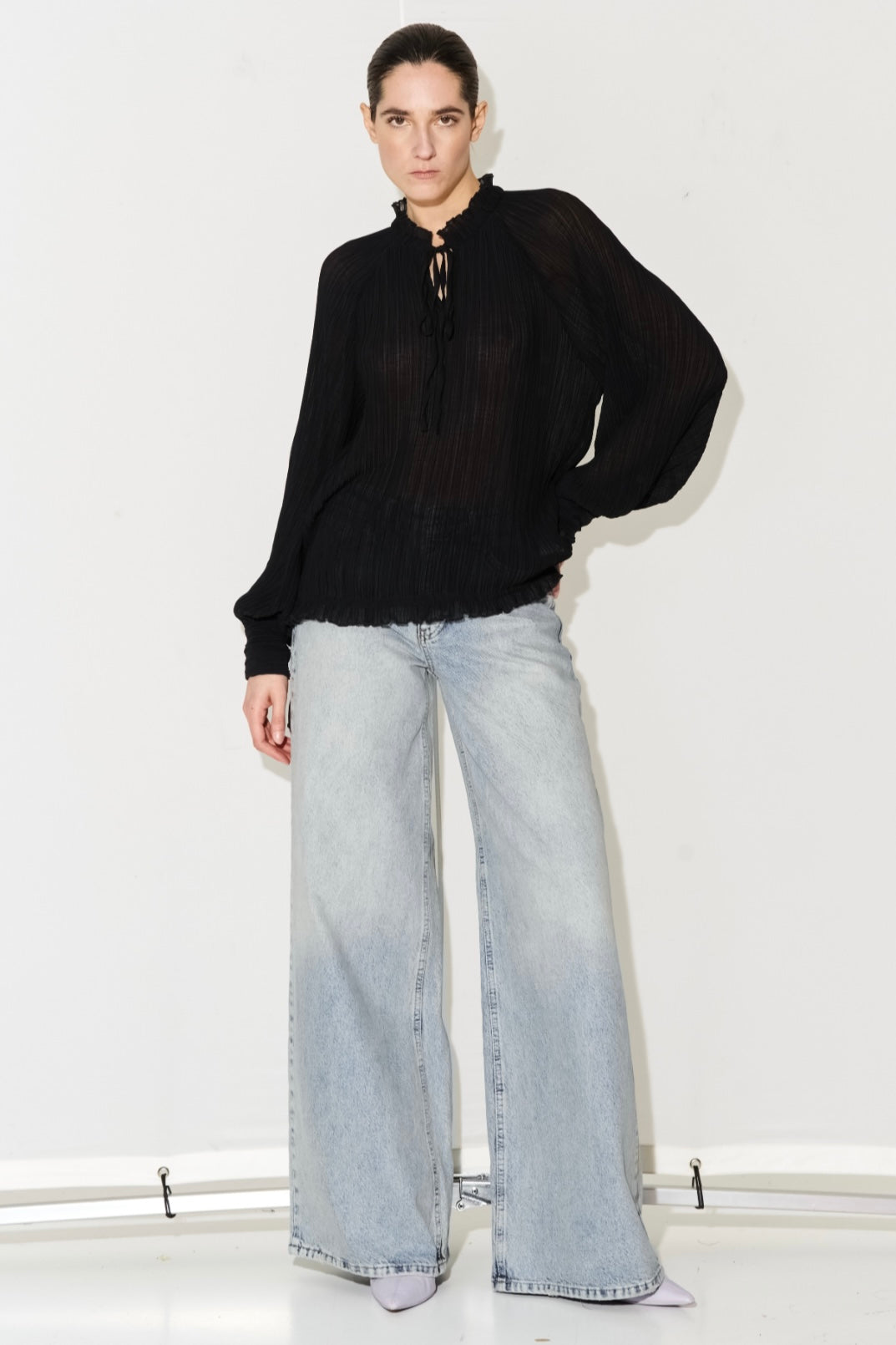 Elegante camicia caratterizzata da un raffinato voilant al collo con laccino regolabile e fiocco, completato da un dettaglio coordinato e regolabile anche lateralmente in basso. Il polsino delle maniche è tagliato alto per un'estetica moderna e sofisticata. Disponibile nei colori classici bianco e nero, nelle taglie S/M e M/L. Scopri questa creazione presso il nostro punto vendita a Pistoia, Via Porta Carratica 66.