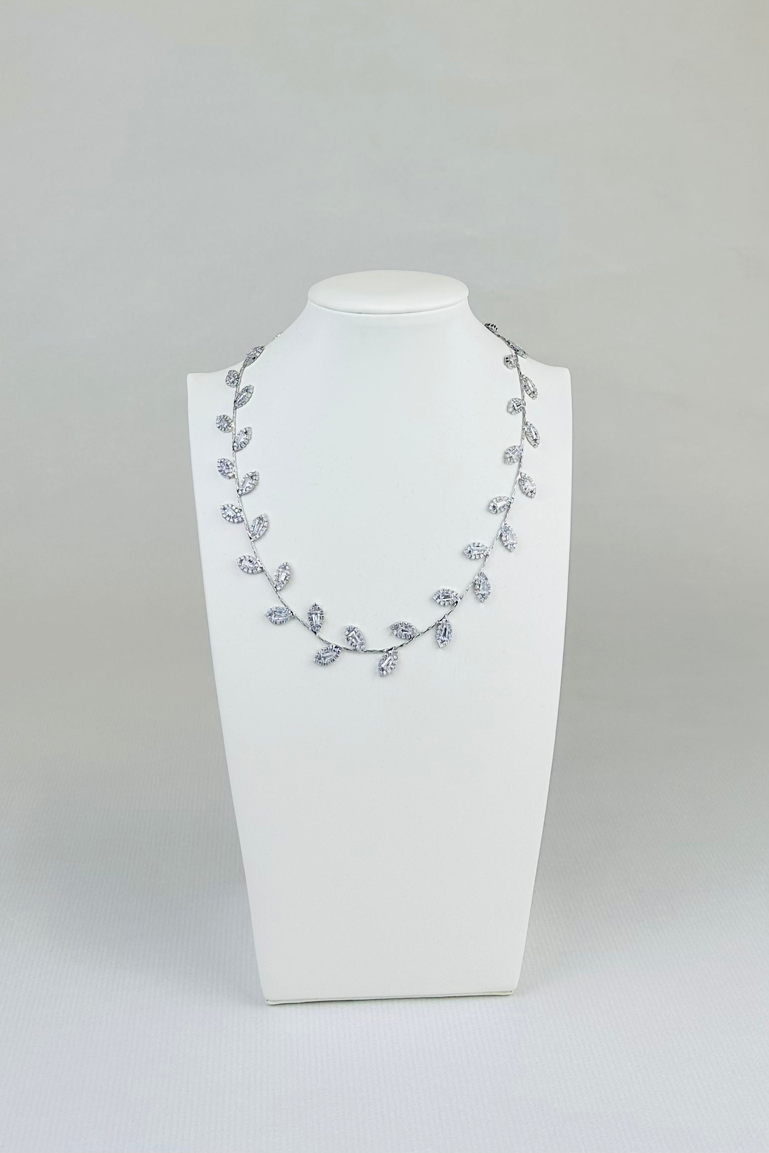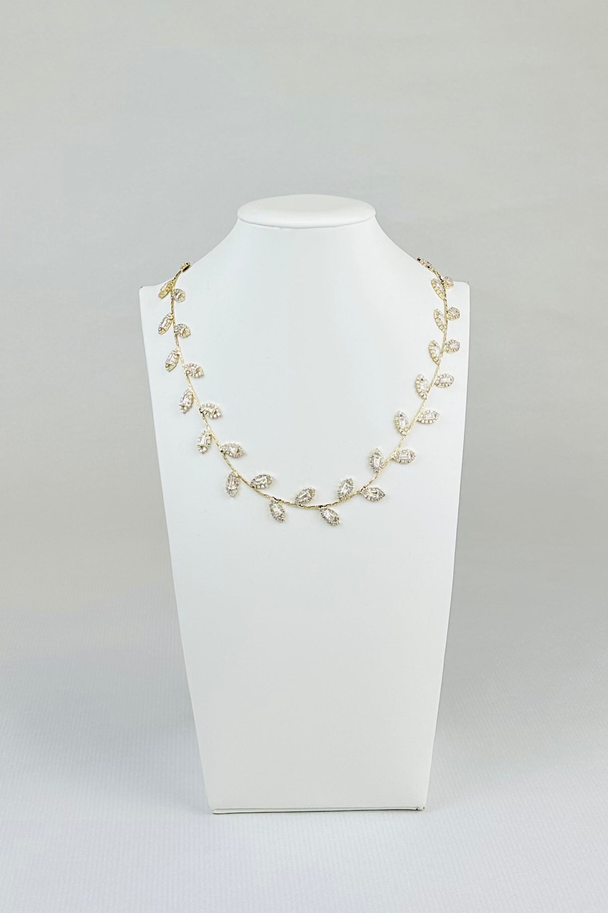 Collana girocollo elegante con delicate foglie impreziosite da strass che catturano la luce con raffinata brillantezza. Disponibile in finitura oro e argento, si distingue per il suo design sofisticato ideale per occasioni speciali e cerimonie. Perfetta per chi ricerca un accessorio versatile che eleva lo stile, si abbina magnificamente con orecchini e bracciale della stessa collezione, creando un look coordinato e curato nei dettagli.