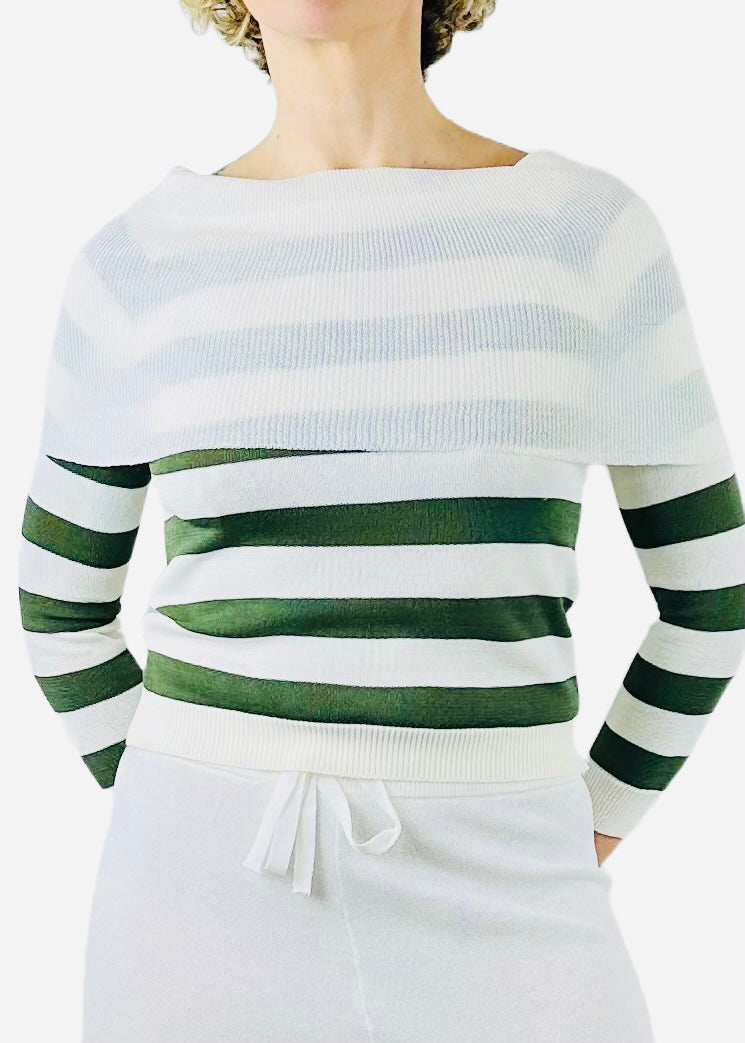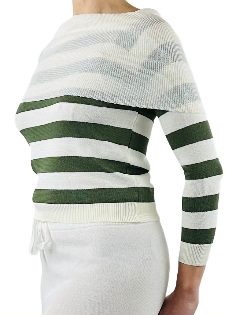 Maglia in viscosa mix con linee orizzontali colorate scollo maxi con tessuto in tinta che scende sulle spalle creando possibilità' di vestirlo in molti modi diversi, scoprendo le spalle o lasciato morbido e confortevole, adatto a un look giovane e dinamico.