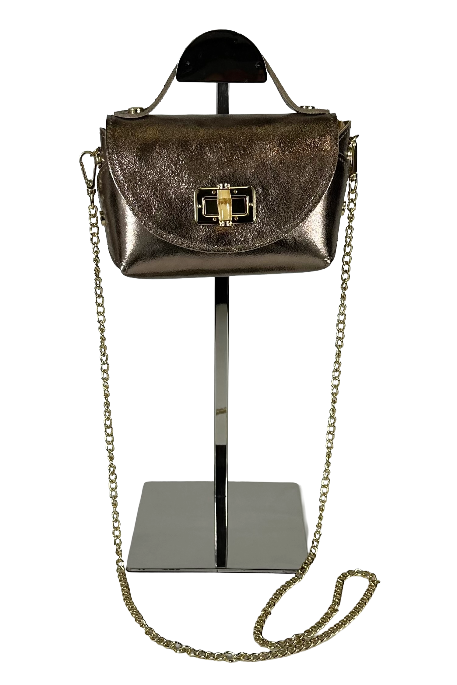 Scopri il fascino di questa piccola borsa tracolla che unisce eleganza casual e artigianalità italiana. Realizzata in pelle pregiata, vanta una catena dorata che cattura la luce con stile e un'esclusiva chiusura in bamboo che aggiunge un tocco di naturalezza sofisticato. Perfetta per chi ama portare l'essenziale con personalità, questa borsa è il compagno ideale per le tue giornate più dinamiche. Fatto in Italia, con amore per i dettagli.