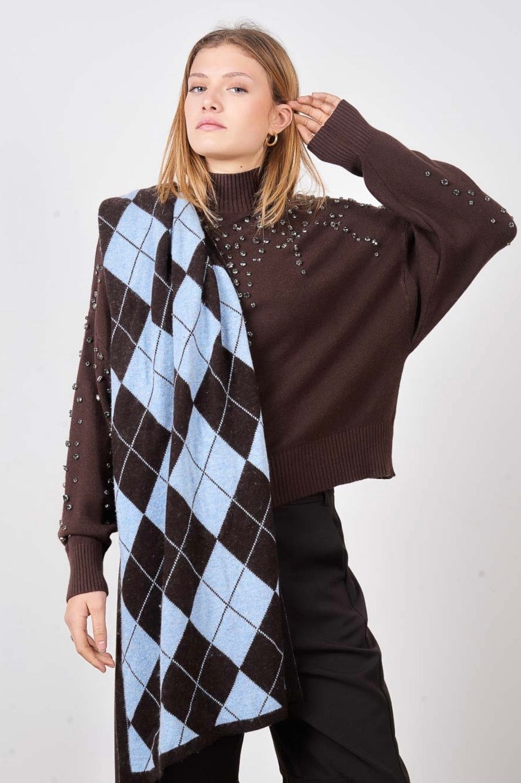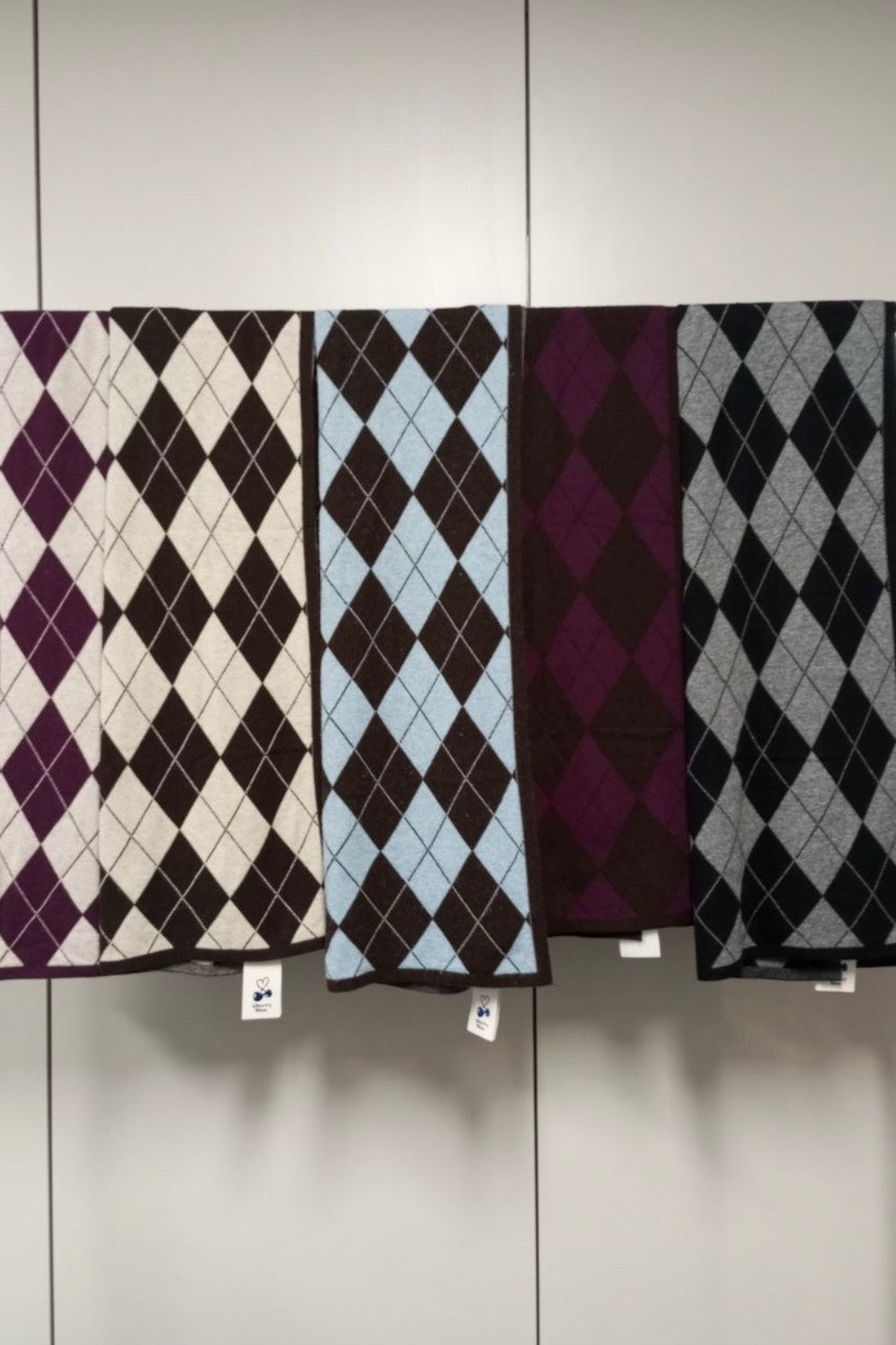 Sciarpa reversibile in pregiato misto cashmere e lana, perfetta per chi ricerca qualità e versatilità. Il motivo a rombi conferisce un'eleganza senza tempo, adattandosi con armonia a ogni capospalla. Disponibile in due raffinate combinazioni cromatiche: marrone moka e celeste oppure marrone moka e vinaccia. Con dimensioni generose di 175x70 cm, offre morbidezza straordinaria al tatto e un calore avvolgente. Un accessorio giovane e sofisticato che completa qualsiasi guardaroba con stile classico.