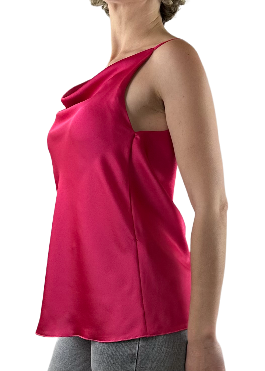 Il top in tessuto fluido satin presenta un particolare drappeggio sul davanti che crea seducenti effetti di luminosità . Perfetto indossato da solo o con una giacca per dare un tocco glam al look.