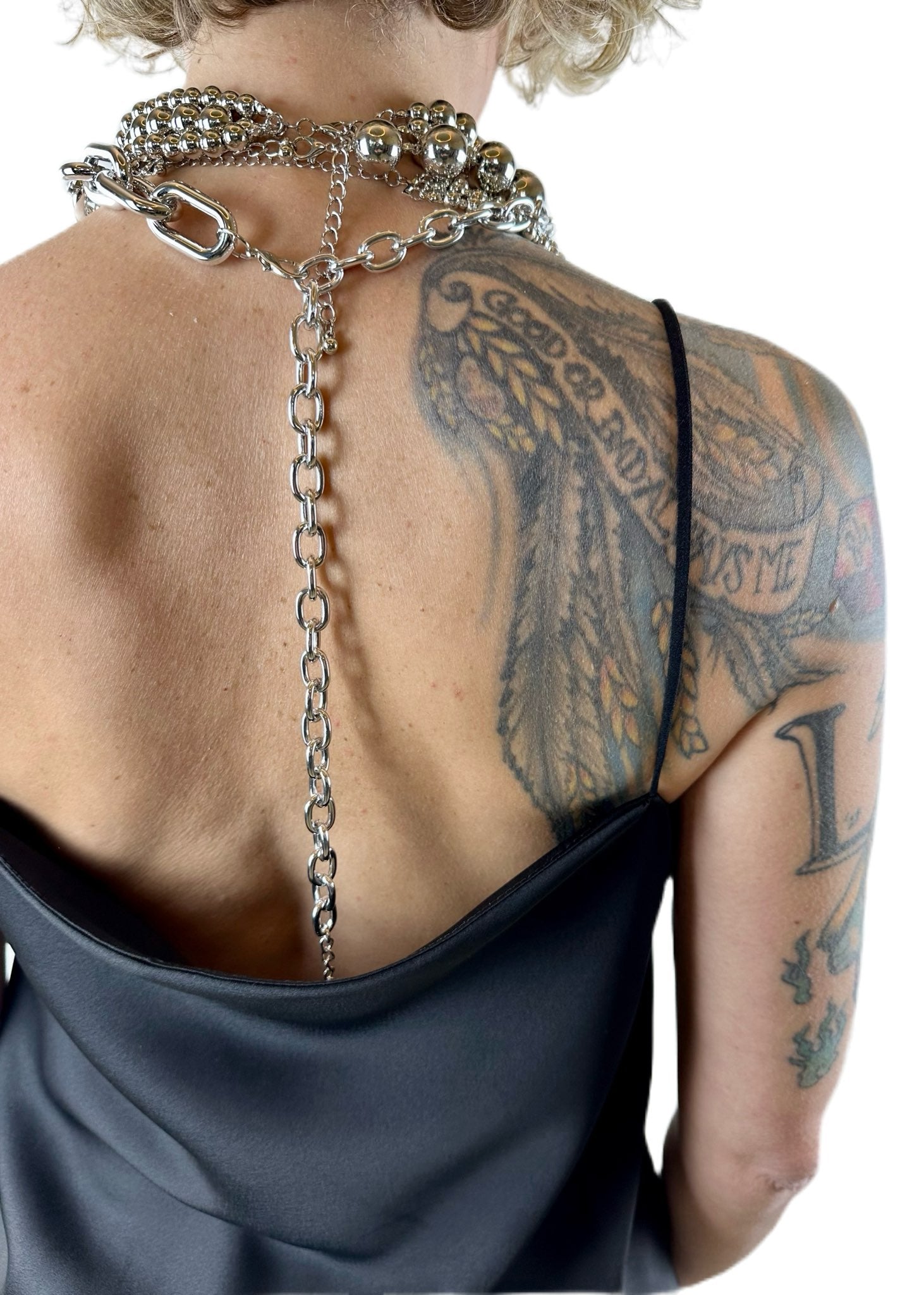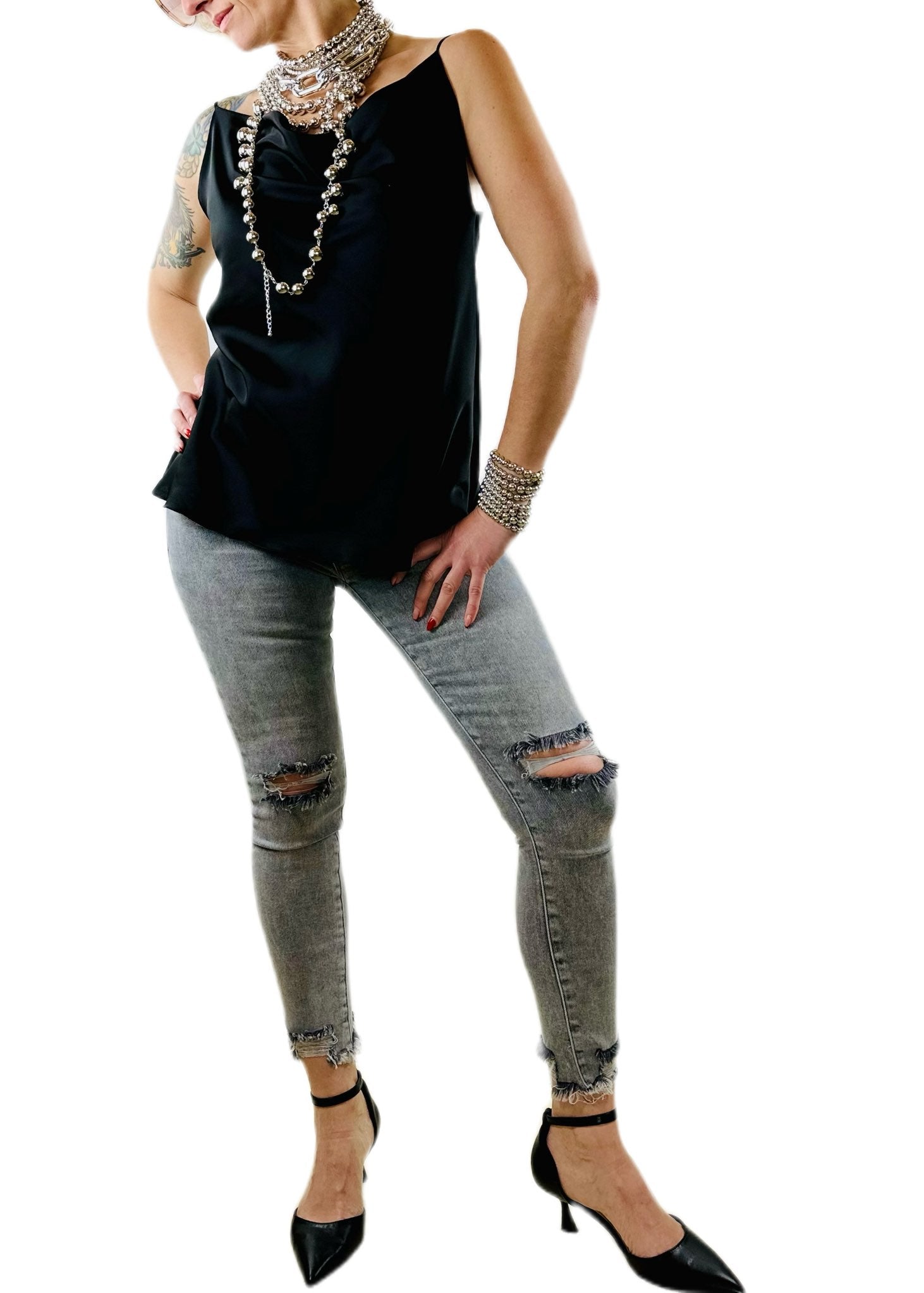 Il top in tessuto fluido satin presenta un particolare drappeggio sul davanti che crea seducenti effetti di luminosità . Perfetto indossato da solo o con una giacca per dare un tocco glam al look.