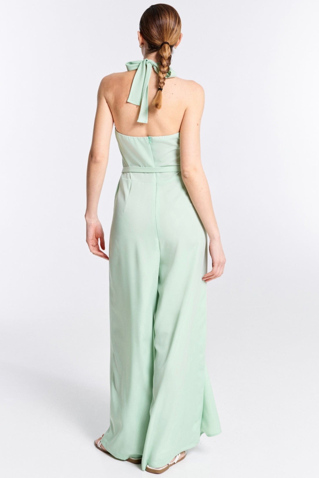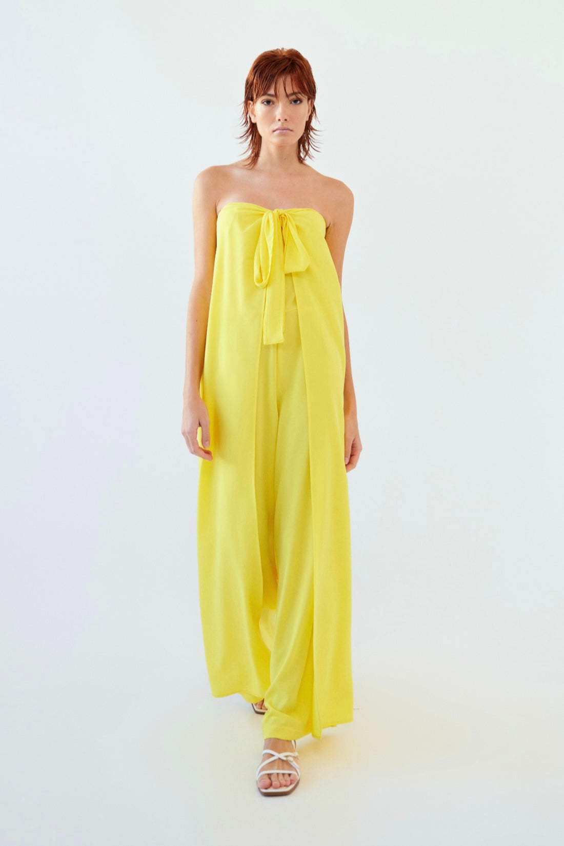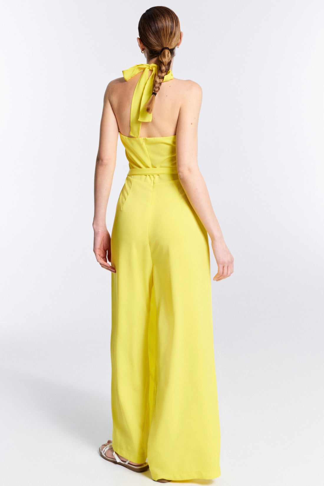Tuta versatile con cintura e fibbia in metallo che offre due stili di indosso: allacciata al collo con incrocio fiocco per un look classico, oppure con fiocco sul retro per scoprire elegantemente le spalle. La vestibilità fit valorizza la silhouette con una linea moderna e raffinata. Disponibile in tre tonalità essenziali—nero, giallo e verde—nelle taglie S/M e M/L, si adatta a diverse occasioni e preferenze stilistiche.