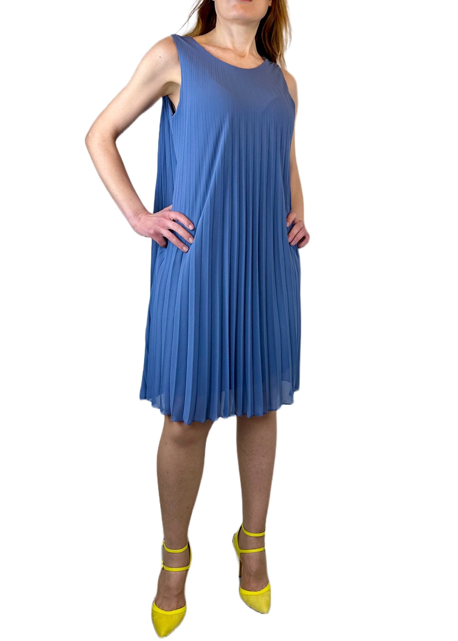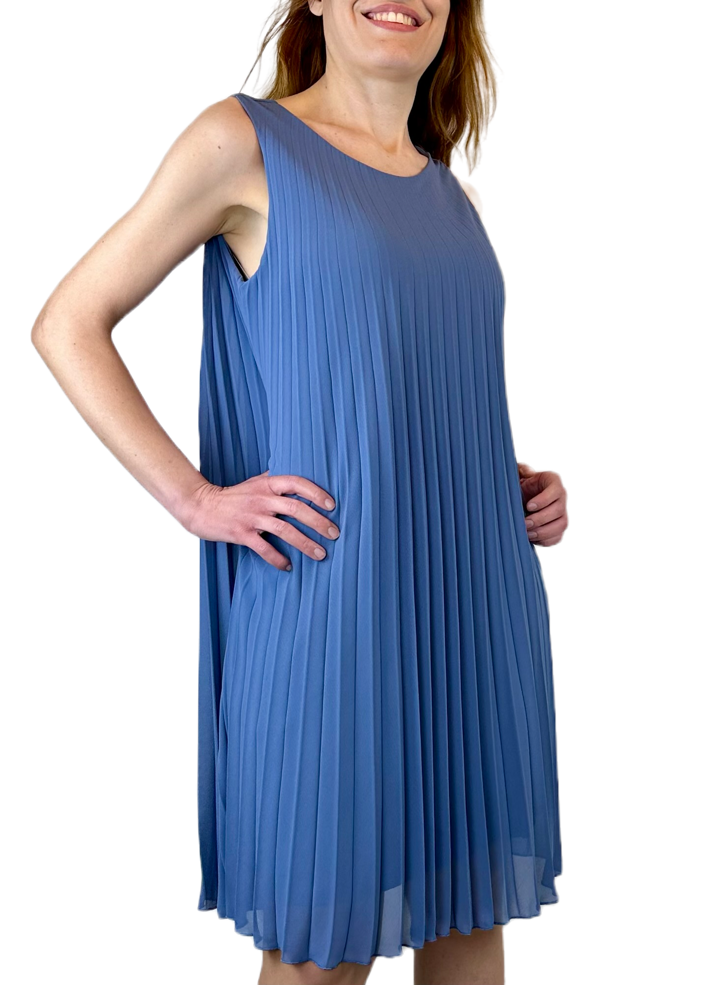 Abito corto, con collo gioiello, smanicato. L'abito si arricchisce di una raffinata lavorazione a plissé soleil. Le tonalità polverose accentuano l'interpretazione contemporanea della femminilità.